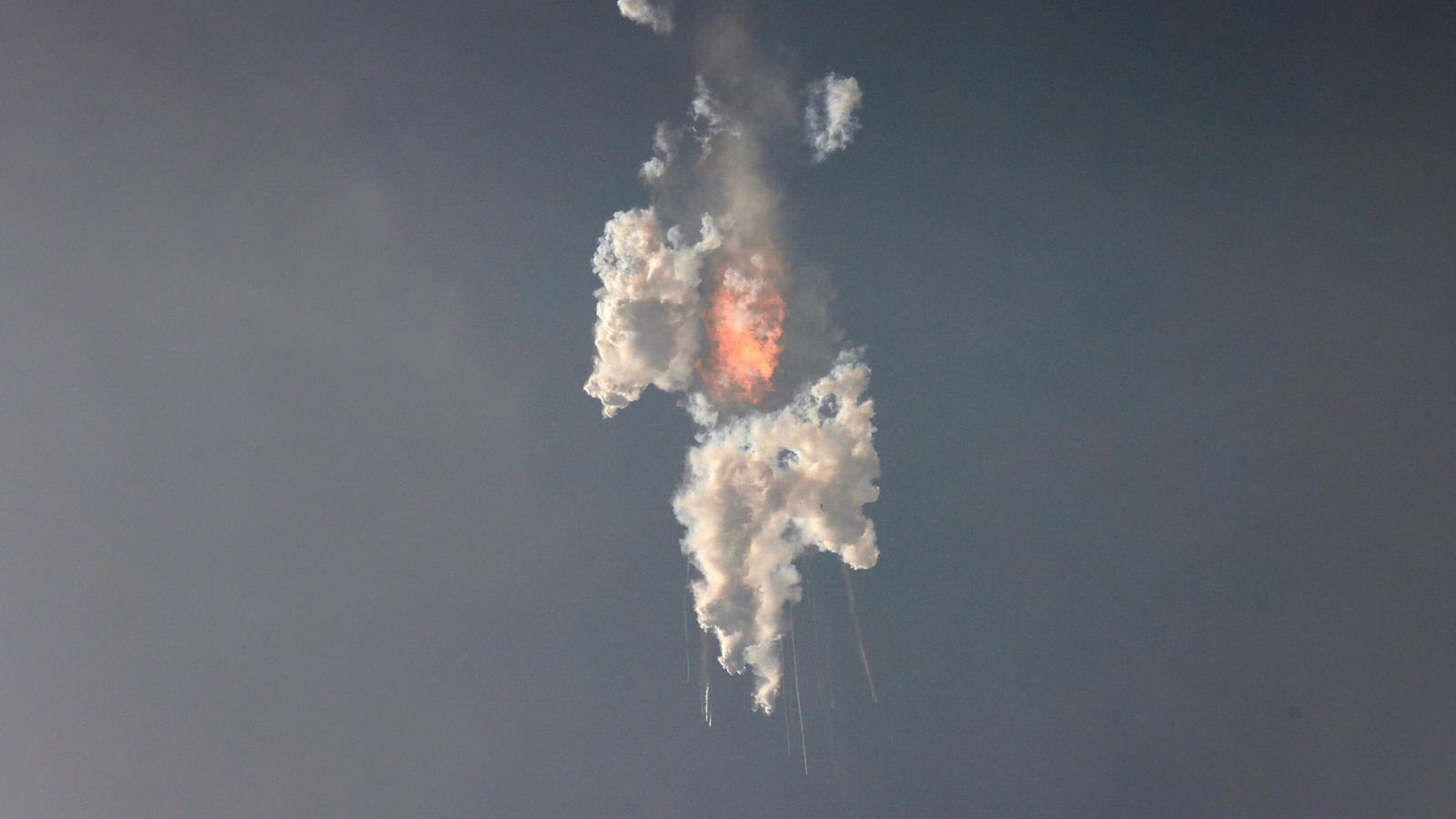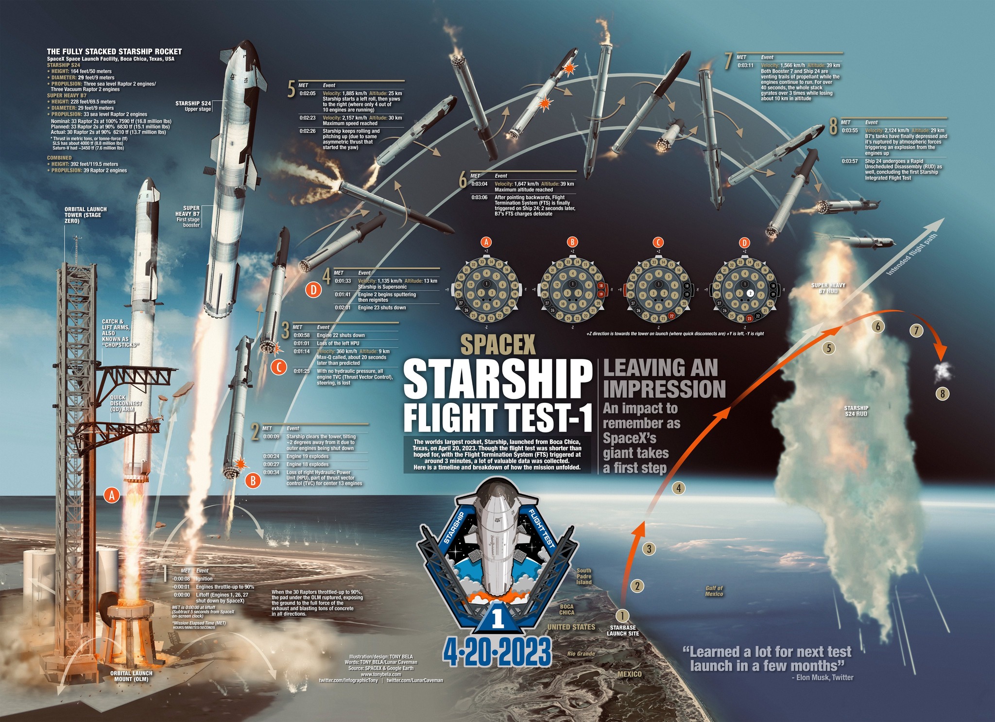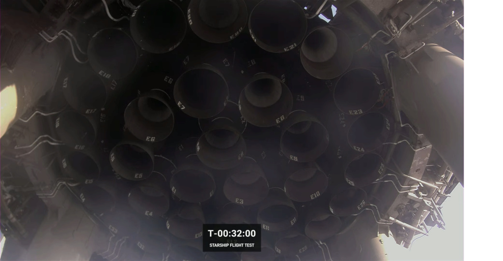 Perte d'un 6e moteur Raptor, moteur E2 au centre, vers 1 mn 20 s. Les moteurs E1, E2 et E3 sont disposés au centre. Les E4 à 13 sont autour, démarrant à coté du E1 . Enfin, les moteurs E14 à E33 forment la couronne externe, démarrant entre les E4 et 5. Le moteur E1 au centre et les moteurs E18, (E19), E22, E26 et E27 sont éteint sur la couronne externe. A T+ 15 s, 3 moteurs se sont arrêtés, le E1 au centre et les E 26 et 27 sur la couronne externe. A T+ 40 s, un autre moteur de la couronne externe s'arrête puis un autre à T+ 1mn, des débris sont aperçus sortant de la baie moteur, certains des carénages aérodynamiques des réservoirs et des canalisations ainsi que le système HPU (Hydraulic Power Unit). A T+100 s, un 6e moteur ne fonctionnent plus, il projette des débris et sa flamme devient verte, même si l'un a redémarré quelques secondes plus tard et d'autres sont tombés en panne. A T+ 1mn 54s, il y a une autre grosse éruption, puis tout le panache devient rouge. Le MECO, extinction des moteurs devait intervenir à T+ 169 secondes, 2mn 49s, suivi de la séparation du Starship et de la mise à feu de ses six moteurs Raptor. A 2 mn 28 s, le lanceur atteint sa vitesse maximale (2157 km/h) et son attitude change brusquement. Sa trajectoire en arc pour la séparation du Starship finie en une boucle. La vitesse diminue, mais on continue de voir des flammes. A 2 mn 57 s, alors qu'il a fait un salto arrière, la vitesse augmente de nouveau, de 1747 km/h à 1789 à 3 mn 03 s et on continue de voir des flammes. La vitesse diminue à nouveau et augmente jusqu'à 3 mn 25 s (1756km/h). La chute du lanceur de 39 à 29 km d'altitude augmente encore un peu sa vitesse. Le lanceur virevolte 3 fois sur lui même durant près de 1 minute 40 secondes (de T+ 2 mn 30 s à T+4 mn). Le centre de contrôle Space X déclenche le FTS de bord, système d'auto destruction qui détruit le lanceur incontrôlable en 2 partie à T+3mn 59s. Montage photos des dégâts sur le pad de tir OLM, Orbital Launch Mounth et au alentours. A gauche, an bas, la structure bétonnée du pad en construction