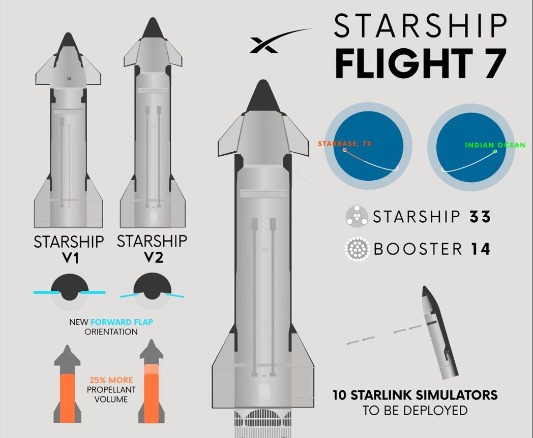 IFT 7 Le vol IFT 7 a lieu le 16 janvier 2025 avec le même profit suborbital que les vols précédents. C'est la seconde capture d'un booster Super heavy, le B14. Le Starship 33, premier vaisseau Bk2 continue son vol, mais perd plusieurs moteurs ainsi que du carburant (CH4). La télémétrie est perdu à 8mn 30s et le vaisseau explose à T+11 mn 30. Le Ship SN33 est équipé de moteurs Raptor 2, capable de placer de 100 à 200 tonnes en LEO, selon qu'il soit récupéré en mer ou laissait en orbite. Le Ship mesure 1,8 m de plus avec une soute plus petite permettant l'emport de plus de carburant. 9 février, le' B15 réalise une mise à feu statique sur son pad. 12 février, Space X annonce que le vol ITF 8 utilisera le Starship S34, le décollage aura leiu le 3 mars depuis le pad A IFT 8 Le vol IFT 8 a lieu le 6 mars 2025, c'est le deuxième vol d'essai impliquant un prototype d'étage supérieur du vaisseau Block 2 , utilisant le Booster 15 (B15) et le Ship 34 (S34) . Il a suivi une trajectoire suborbitale. Avec ce 8e vol d'essai, SpaceX vise à atteindre les objectifs non atteints lors du précédent, le premier déploiement de charge utile et plusieurs expériences de rentrée atmosphérique visant à ramener l'étage supérieur au site de lancement pour sa récupération. Le vol comprend également le lancement, le retour et la récupération du propulseur Super Heavy par la tour. Le vaisseau S34 poursuit son vol jusqu'à l'apparition d'une fuite et d'un incendie dans le compartiment moteur. Avec seulement 2 de ses 6 moteurs restants, tous deux du même côté, et aucun ne pouvant se déplacer, le vaisseau a perdu le contrôle d'attitude. Peu après, les moteurs restants sont tombés en panne et les communications ont été coupées environ 9 minutes et 30 secondes après le décollage. Le S34 est détruit en vol.