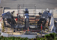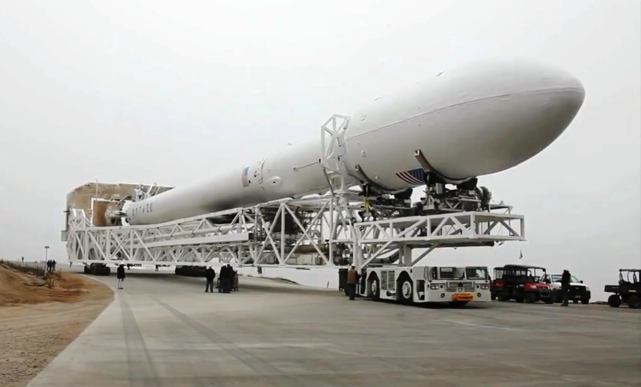 Vue satellite du SLC4 de Vandenberg AFB en juillet 2012. Le pad 4W est à gauche, encore intact. A droite, le pad 4E, le hangar HIF est déjà construit, les travaux se concentrent sur la route le reliant à la table de lancement. Seul le vieux carneau est resté en état. Vue d'ensemble du SLC 4E et du pad en construction. Vue en détail, le massif, à gauche supportera la table de lancement du TE, le carneau sort à gauche. A droite, les fondations du système de vérins de relevage du TE. A gauche, le carneau du SLC4E en réfection pour le Falcon. A droite, le système de vérins hydraulique installé dans la tranchée permet le relevage du transporteur avec le Falcon dessus. Le SLC4E pour le Falcon 9. Space X a construit un hangar d'intégration HIF, identique à celui du SLC 40 de Canaveral et un pad avec le T/E. Le transporteur-érecteur TE du SLC 4E a été conçue pour les Falcon 9 V1.1 et la version 9 H à 27 moteurs. Les 2 crochets "hold down" utilisés sur le launch mount du TE pour la version Falcon 9 de base ont été conçus mobiles, de façon à s'adapter à la version Heavy à 3 "core". 3 crochets "hold down" supplémentaires seront alors ajoutés sur les cotés pour alimenter les 2 "core" latéraux. Le système de maintien du lanceur V1.1 du TE et les ombilicaux de remplissage en ergols. Le Falcon 9 V1.1 de Cassiopé sur le pad. L'arceau de maintien du lanceur sur le TE s'ouvre à T-5 mn 30, suivit du retrait du stronback à T-4 mn 30 s. Le Falcon 9 Cassiope prêt pour l'essai statique au sol. C'est le 29 septembre 2013 que la première Falcon 9 V1.1 quitte le SLC 4E pour mettre en orbite le satellite Cassiopé et des CubeStas. Le premier étage n'a pas les jambes d'atterrissage, l'étage ne sera pas récupéré en vol. 2014, Space X commence a démolir la tour de service du pad 4W pour en faire une zone d'atterrissage des premiers étages du Falcon 9. Elle a été positionné sur son parking depuis le dernier tir d'un Titan 2 en 2003 puis déplacer sur le pad pour préparer sa démolition par explosif.