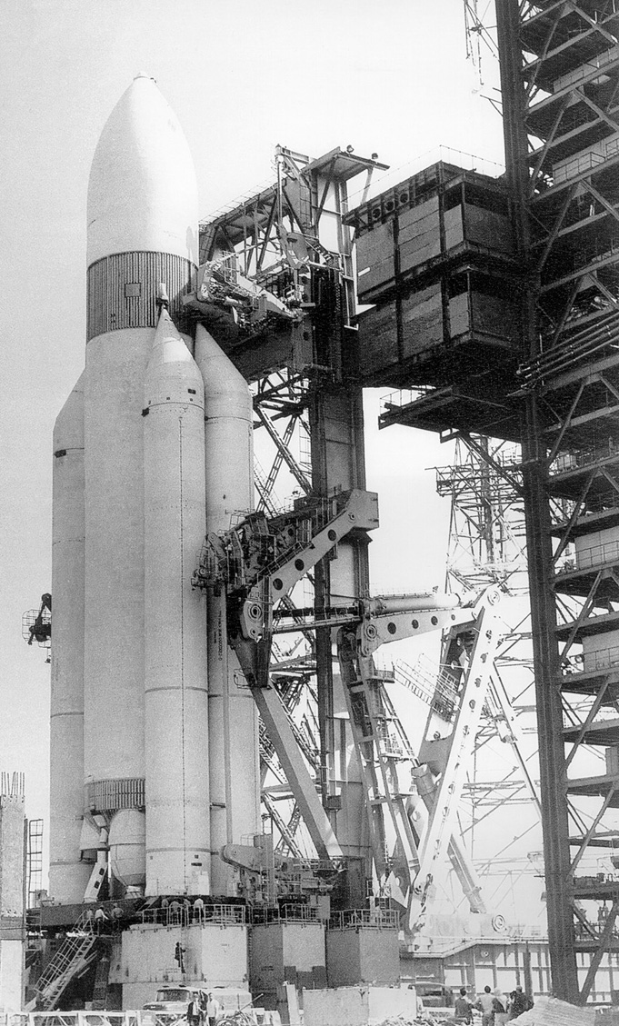 Le lanceur N1 sur son pad de tir 1972, l'organisation du spatial soviétique est entièrement revue. NPO Energia qui remplace les bureaux d'études OKB est dirigé par Gloushko remplaçant de Michine. Pour la petite histoire, Gloushko était contre le projet N1 de Korolev et les échecs du lanceur ont précipité son arrêt. Le but de l'URSS est maintenant de contrer les Américains qui construisent la navette spatiale capable de relier l'espace proche pour amener et récupérer des satellites. Gloushko voit lui plus grand, un grand système associant un lanceur de grande capacité (100 tonnes en LEO) et un véhicule réutilisable. Entre 1974 et 1979, le projet semble suspendu aux yeux des occidentaux, car aucune nouvelle ne sort concernant le lanceur et aucune activité n'est repérée sur les installations de lancement. Les deux pad du N1, situés à 5 km des lance Soyouz sont équipés de tour hautes de 183 m, destinées à l' observation et servant de paratonnerre. La table de lancement est circulaire avec trois déflecteurs de flammes et une tour ombilicale desservie par un portique roulant. Comme sur les autres pads, le lanceur est amené à l' horizontale et dressé à la verticale par des wagons tracteur érecteur. Le troisième étages et la charge utile est monté au sommet par les portiques. Ces installations réalisées pour le lanceur lunaire seront reprises pour le super lanceur. En URSS, les efforts portent sur la fiabilité des