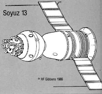 Soyouz 13 est lancé le 18 décembre 1973 à 11 h 55 pour une mission scientifique. A bord, Pyotr I. Klimouk, Valentin V. Lebedev, l'équipage doublure. Ils observent durant près de 7 jours la comète de Kokoutek avec les astronautes américain de la station Skylab. Ils utilisent aussi le télescope "Orion 2" placé sur l'avant du vaisseau pour photographier le ciel en UV. L'équipage revient sur terre le 25 après un vol de 7 jours 20 h 56 min sur une orbite 225-272 km. Dans un premier temps, on spécule sur le fait que ce Soyouz ait été lancé pour secourir Cosmos 613, un Soyouz automatique lancé le 30 novembre pour un vol de 60 jours vers un Saliout. Soyouz 13 est probablement un vaisseau "tampon" en attente d'une station Saliout ou un test de vaisseau pour le vol commun ASTP en 1975.