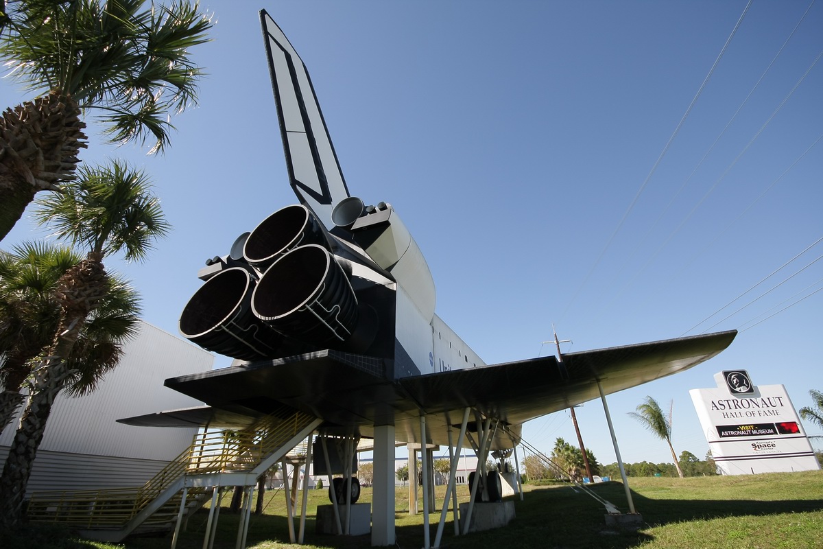 A l'extérieur du Hall of fame, visible de la route une maquette de navette spatiale nommée "Shuttle to Tomorrow," avec un cinéma incorporé permet depuis 1992 de vivre les missions STS. La salle était en restauration lors de ma visite en 2008. L'entrée du musée avec la statue de Gagarine. l'incontournable boutique de souvenir. Une console Gemini venant du MCC de Houston, une cabine Gemini d'entrainement et une console Apollo Mercury MA8 Le siége Mercury de Slayton et la tenue Gemini 7 Une maquette du LM suspendue, quelques "artifact" Apollo et le module de commande Apollo 14
