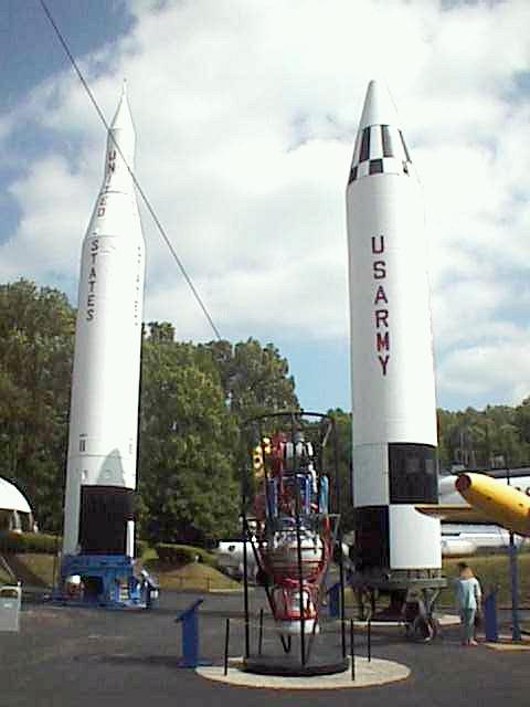 l'extérieur du bureau principal au bord de la "Redstone road". Il comprend une Redstone, un Jupiter C,