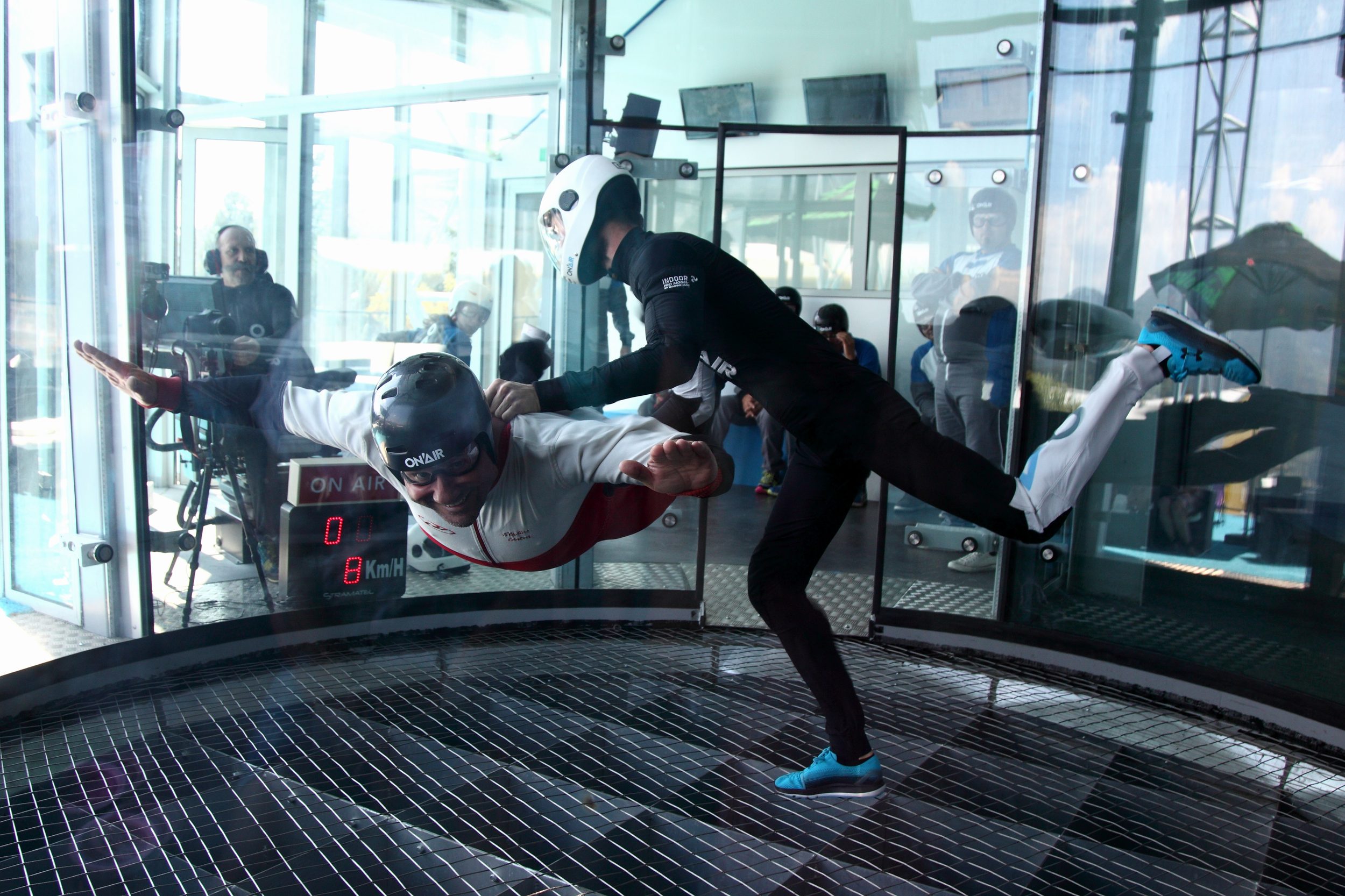 Ouverte depuis le début du mois de juillet 2016, la soufflerie de « One Air » à Tallard, au sud de la ville de Gap (Hautes Alpes) ravit les petits comme les grands à la recherche de sensations fortes. « C’est un simulateur de chute libre explique Patrick Bergouuignan, le dirigeant et ancien membre de l’équipe de France de vol relatif, qui remplace toutes les sensations que l’on peut avoir en chute libre avec toutes les facilités qu’on pourrait avoir sans avoir les contraintes. » La soufflerie n’est pas réservée à une élite parachutiste, loin de là. « Elle est ouverte à tous, à partir de cinq ans, pour des vols d’initiation ou de perfectionnement », précise Elisa Bergouignan, chargée de la communication et fille de Patrick et Isabelle. L’équipe qui comprend une dizaine d’employés compte aussi sur un public de vacanciers. Construite sur le spot le plus prisé du parachutisme français, la soufflerie culmine à 18 m de hauteur. Le tube de verre où les personnes évoluent mesure 8 mètres de hauteur pour 4,5 m de diamètre. Il assure une visibilité sur 360°, fait unique en Europe. « On a choisit de faire cela pour reproduire au maximum la réalité d’un saut dans la région, où une session de parachutisme est presque toujours synonyme de beau temps et de jolis paysages. Et aussi parce que c’est plus agréable d’avoir vue sur les montagnes que sur un mur »… J'ai donc testé cette soufflerie fin août, un samedi après midi. Le lieu est très sympathique. Le bâtiment de 800 m2 est situé dans l'aéropole de l'aérodrome. On y accède par le nouveau carrefour qui coupe la RN85 en direction de Gap. Au premier étage, l'accueil avec son petit coin restauration, ses fauteuils et canapés pour que le public profite aussi du spectacle. L'accueil, la terrasse avec vue sur le tube et sur l'aérodrome. L'écran où est inscrit les heures de passage en soufflerie avec le nom de chacun. Après paiement et signature des papiers habituels de décharge de responsabilité, Patrick me fournit mon équipement, la combinaison, les baskets, le casque et les lunettes. On enfile tout çà, tant bien que mal et direction salle de briefing. Une dizaine de minutes pour apprendre quelques règles de sécurité, comment on rentre dans le tube, comment on sort, la bonne position, les gestes à faire et à pas faire. « Il faut juste s’étaler sur l’air, pour pouvoir voler plus facilement. On vient placer le bassin, on pousse un petit peu le centre de gravité vers le bas. Les jambes et les bras vont permettre de stabiliser l’ensemble ». Uhmm, facile à dire ! Voila, je suis paré pour mon premier vol "libre" ! combinaison, bouchons dans les oreilles, lunettes et casque. Pour mon