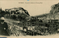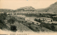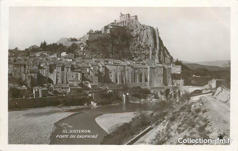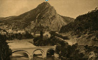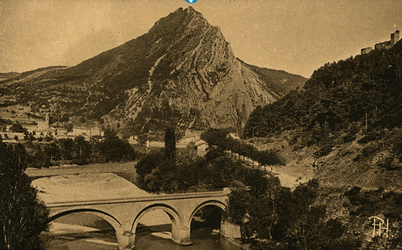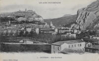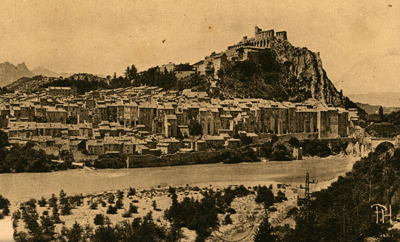 Une des plus vielle, sinon la plus vielle photo de Sisteron, prise en 186, gravée sur papier 50 ans après la découverte de la photographie par Nicéphore Niepce. A gauche, la montagne de la Baume et à droite, la face Nord de la Citadelle. Le pont du Buech n'a pas encore été détruit pour y construire le nouveau. Pas de viaduc pour le train et pas encore de végétation.